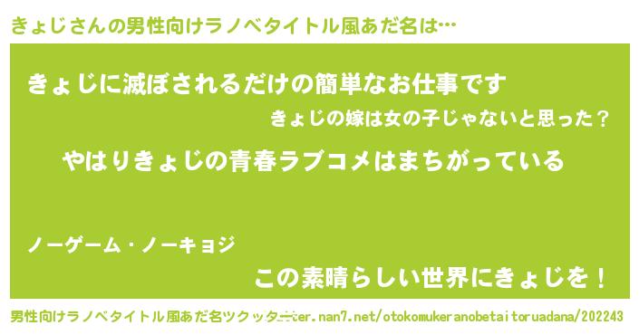 | 女子向けラノベタイトル風あだ名 | 『きょじの雑貨屋さん』 |