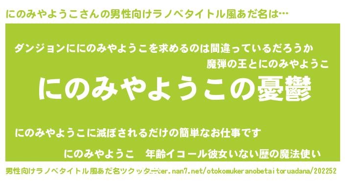 | 女子向けラノベタイトル風あだ名 | 『にのみやようこ姫と円卓の騎士』 |