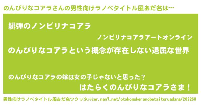 | 女子向けラノベタイトル風あだ名 | 『異世界で失敗しない100ののんびりなコアラ』 |