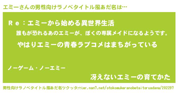 | 女子向けラノベタイトル風あだ名 | 『エミーの雑貨屋さん』『闇のエミー』 |
