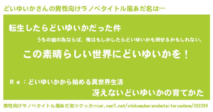 | 胡散臭い通販商品みたいなあだ名 | 『あなたにだけ特別に提供する100年もののヴィンテージワイン…その名も「どいゆいか」』 |