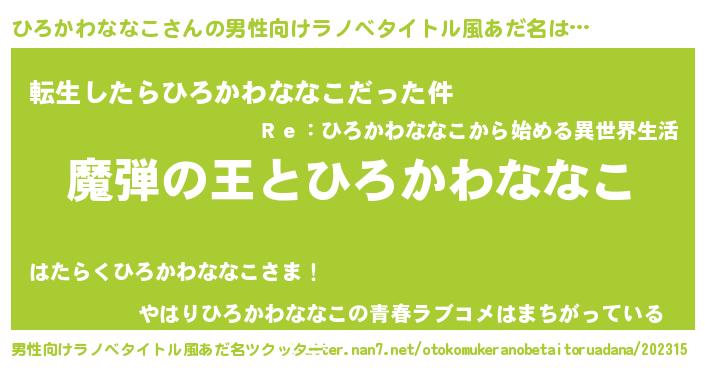| 女子向けラノベタイトル風あだ名 | 『ひろかわななこが死なない童話 林檎のひろかわななこの診療簿』 |