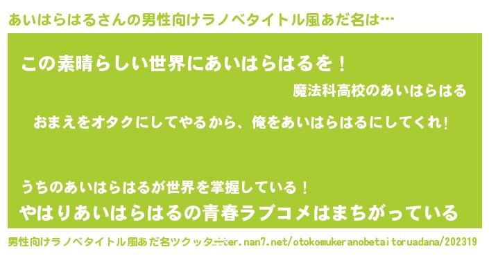 | 女子向けラノベタイトル風あだ名 | 『あいはらはる夫妻のなれそめ』 |