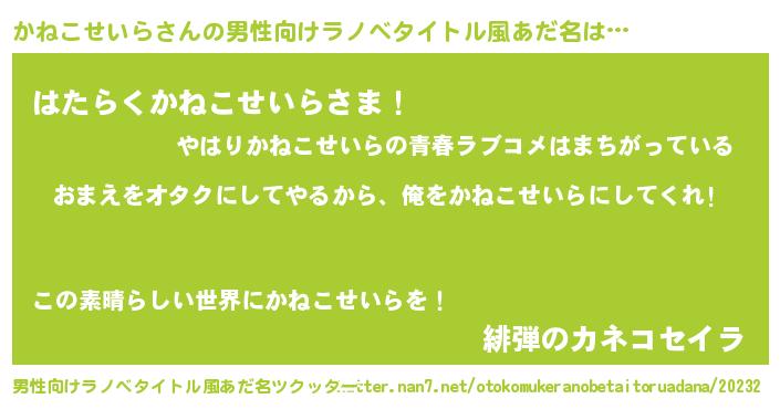| 女子向けラノベタイトル風あだ名 | 『かねこせいら夫妻のなれそめ』 |