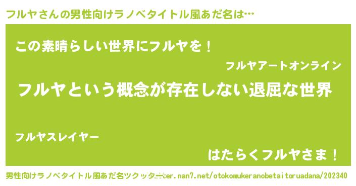 | 女子向けラノベタイトル風あだ名 | 『異世界で失敗しない100のフルヤ』 |
