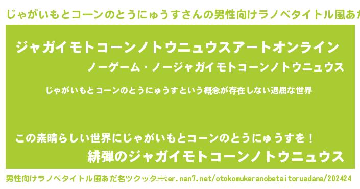 | 女子向けラノベタイトル風あだ名 | 『異世界で失敗しない100のじゃがいもとコーンのとうにゅうす』 |