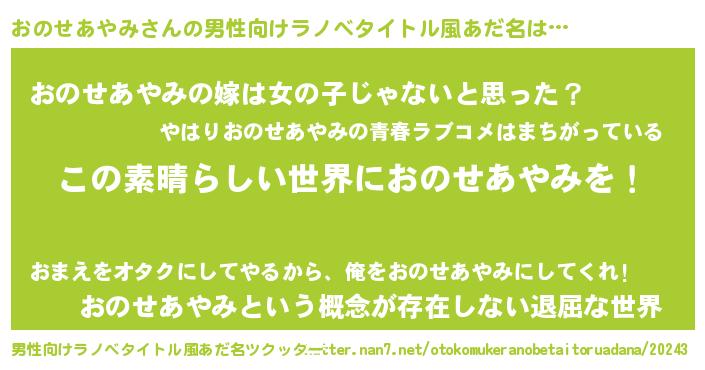 | 女子向けラノベタイトル風あだ名 | 『乙女ゲームの破滅フラグしかない悪役おのせあやみに転生してしまった…』 |