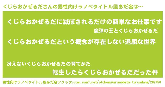 | 胡散臭い通販商品みたいなあだ名 | 『絶対に幸福をもたらす健康食品…その名も「くじらおかぜるだ」』 |