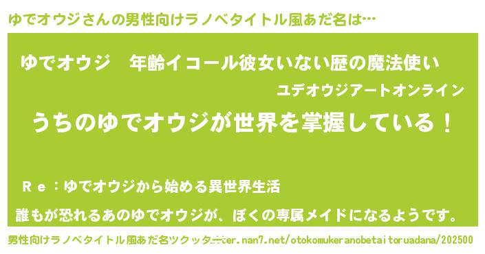 | 女子向けラノベタイトル風あだ名 | 『男装ゆでオウジの憂鬱な任務』 |
