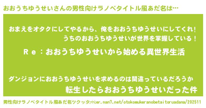 | 女子向けラノベタイトル風あだ名 | 『おおうちゆうせいストレイドッグス』 |