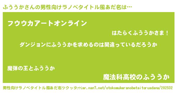 | 女子向けラノベタイトル風あだ名 | 『ふううかの卵を拾いまして』 |
