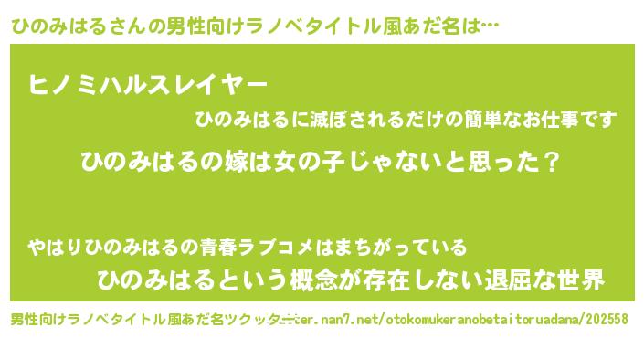 | 女子向けラノベタイトル風あだ名 | 『ひのみはるの卵を拾いまして』 |