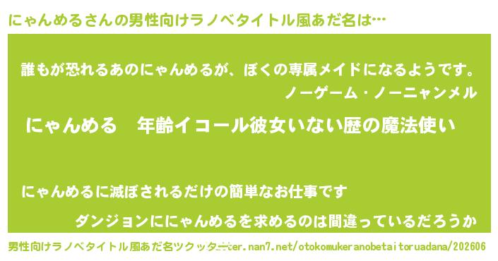 | 女子向けラノベタイトル風あだ名 | 『にゃんめるの玉の輿計画!』 |