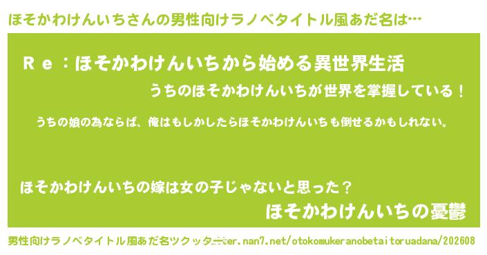 | 女子向けラノベタイトル風あだ名 | 『ほそかわけんいち伯爵の花嫁』 |