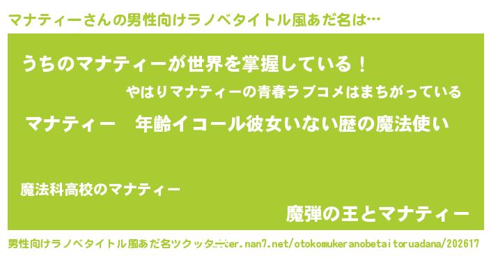 | 女子向けラノベタイトル風あだ名 | 『マナティーの玉の輿計画!』 |