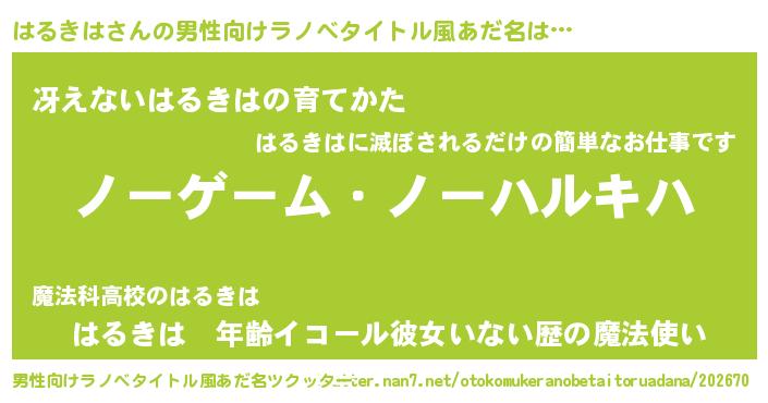 | ヒーロー風カッコイイあだ名 | 『慈愛の使者はるきは』『炎刃騎士ハル』 |