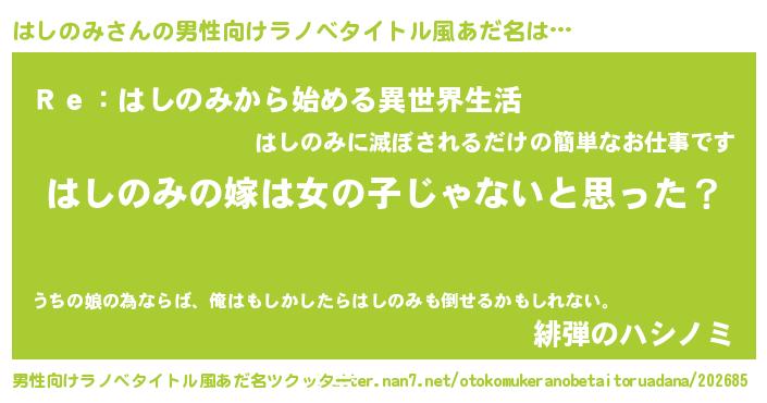 | 女子向けラノベタイトル風あだ名 | 『はしのみ様がみてる』『闇のはしのみ』 |
