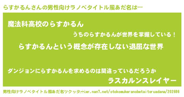 | 女子向けラノベタイトル風あだ名 | 『異世界で失敗しない100のらすかるん』 |
