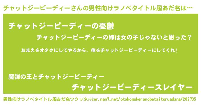 | 女子向けラノベタイトル風あだ名 | 『チャットジーピーディー夫妻のなれそめ』 |