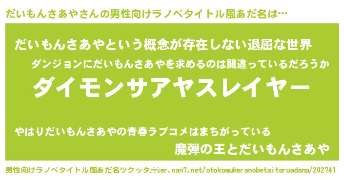 | 胡散臭い通販商品みたいなあだ名 | 『絶対に幸福をもたらす健康食品…その名も「だいもんさあや」』 |