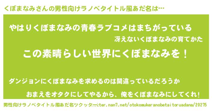 | 胡散臭い通販商品みたいなあだ名 | 『世界中を虜にした100年もののヴィンテージワイン…その名も「くぼまなみ」』 |