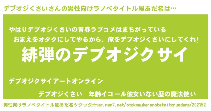 | 女子向けラノベタイトル風あだ名 | 『シンデレラデブオジくさい家の靴箱館』 |
