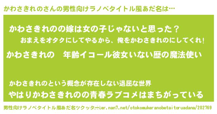 | 女子向けラノベタイトル風あだ名 | 『かわさきれのの玉の輿計画!』 |
