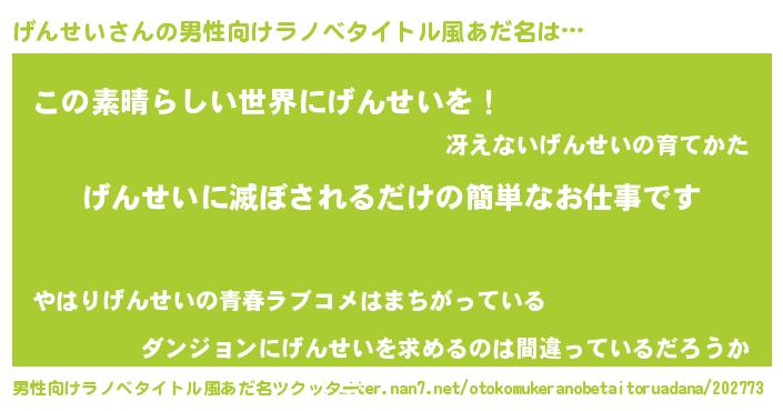 | 胡散臭い通販商品みたいなあだ名 | 『あなたにだけ特別に提供する100年もののヴィンテージワイン…その名も「げんせい」』 |