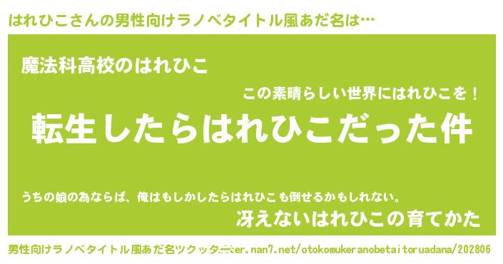 | 女子向けラノベタイトル風あだ名 | 『はれひこの玉の輿計画!』 |