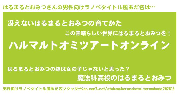 | 女子向けラノベタイトル風あだ名 | 『誰かこのはるまるとおみつを説明してください! ~契約から始まるウェディング~』 |