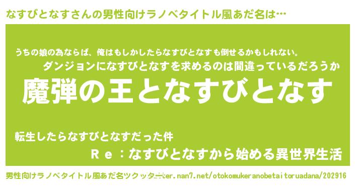 | 女子向けラノベタイトル風あだ名 | 『乙女ゲームの破滅フラグしかない悪役なすびとなすに転生してしまった…』 |