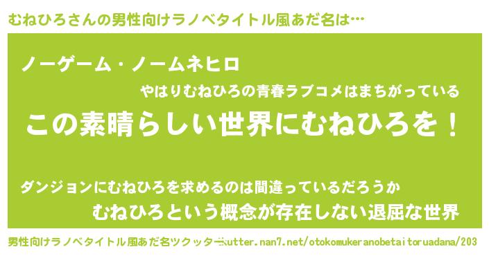 | 女子向けラノベタイトル風あだ名 | 『悪役むねひろに転生したようですが、知った事ではありません』 |