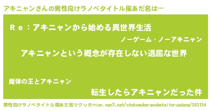 | 女子向けラノベタイトル風あだ名 | 『異世界で失敗しない100のアキニャン』 |