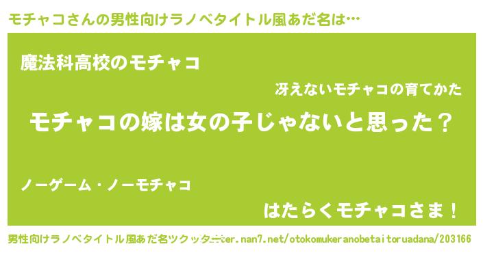 | 女子向けラノベタイトル風あだ名 | 『モチャコの卵を拾いまして』 |