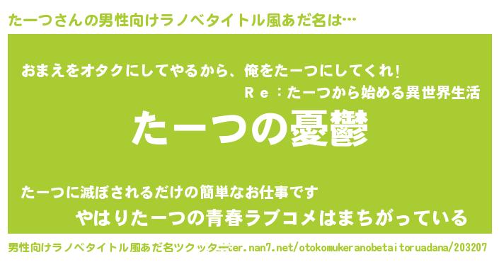 | 女子向けラノベタイトル風あだ名 | 『(仮)たーつのやんごとなき事情』 |