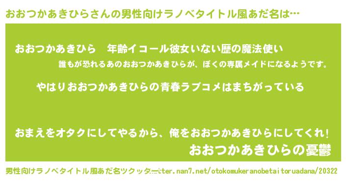 | 女子向けラノベタイトル風あだ名 | 『おおつかあきひら伯爵の花嫁』 |
