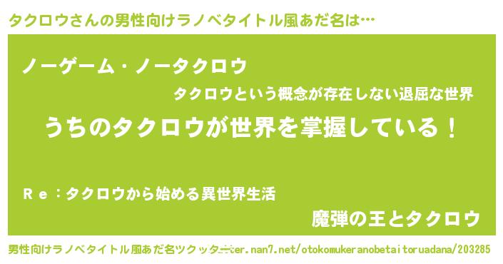 | 女子向けラノベタイトル風あだ名 | 『男装タクロウの憂鬱な任務』 |