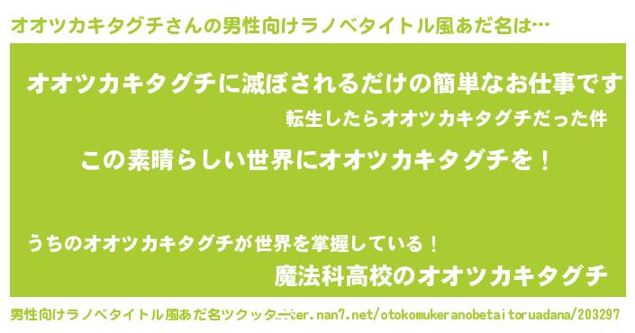 | 女子向けラノベタイトル風あだ名 | 『悪役オオツカキタグチに転生したようですが、知った事ではありません』 |