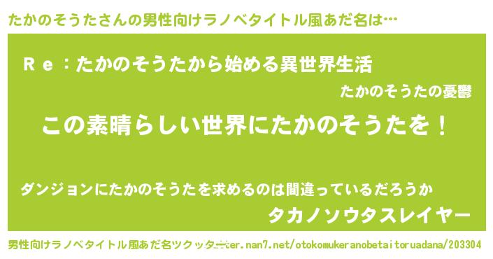| 女子向けラノベタイトル風あだ名 | 『乙女ゲームの破滅フラグしかない悪役たかのそうたに転生してしまった…』 |
