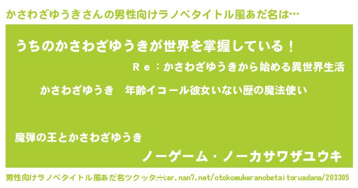 | 伝説のあだ名 | 『救世主となる錬金術士かさわざゆうき』 |
