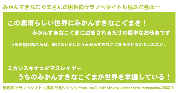 | 女子向けラノベタイトル風あだ名 | 『みかんすきなこぐま伯爵の花嫁』 |