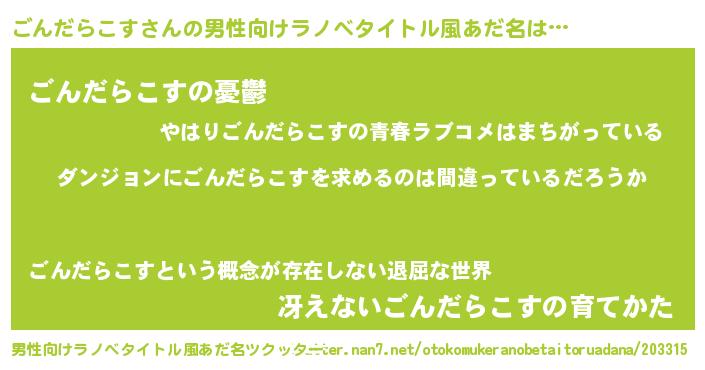 | 女子向けラノベタイトル風あだ名 | 『ごんだらこすの卵を拾いまして』 |