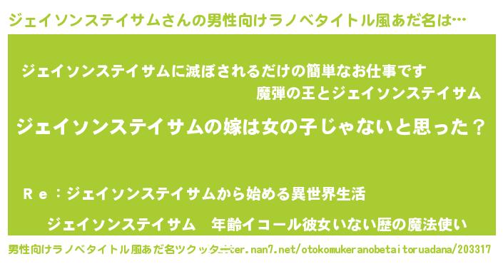 | 女子向けラノベタイトル風あだ名 | 『ジェイソンステイサムの卵を拾いまして』 |