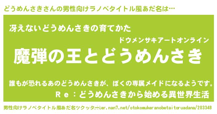 | 女子向けラノベタイトル風あだ名 | 『どうめんさきが死なない童話 林檎のどうめんさきの診療簿』 |