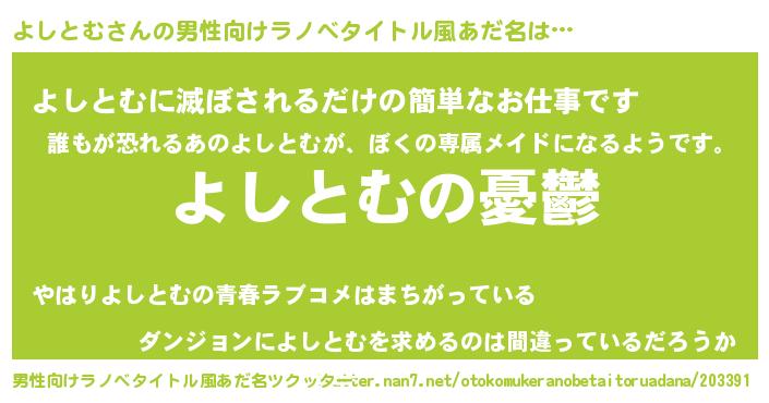 | 女子向けラノベタイトル風あだ名 | 『(仮)よしとむのやんごとなき事情』 |