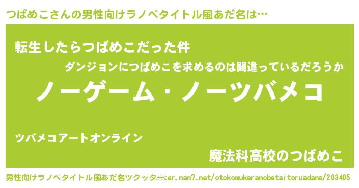 | 女子向けラノベタイトル風あだ名 | 『死神つばめこの再婚』 |