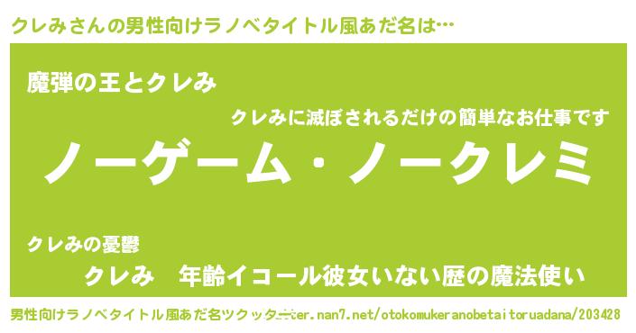 | 女子向けラノベタイトル風あだ名 | 『死神クレみの再婚』 |