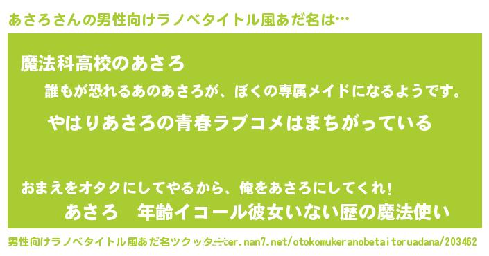 | 女子向けラノベタイトル風あだ名 | 『あさろの雑貨屋さん』 |