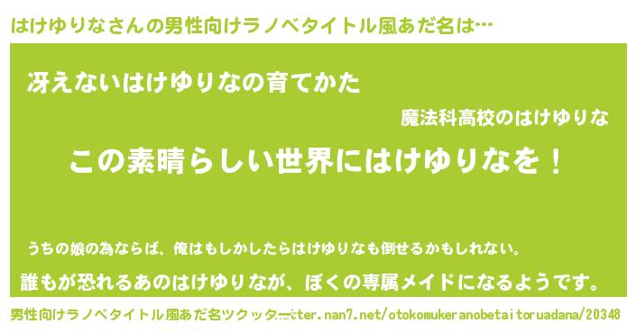 | 女子向けラノベタイトル風あだ名 | 『悪役はけゆりなに転生したようですが、知った事ではありません』 |