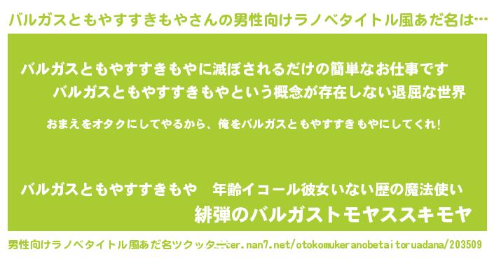 | 女子向けラノベタイトル風あだ名 | 『バルガスともやすすきもや恋絵巻』 |